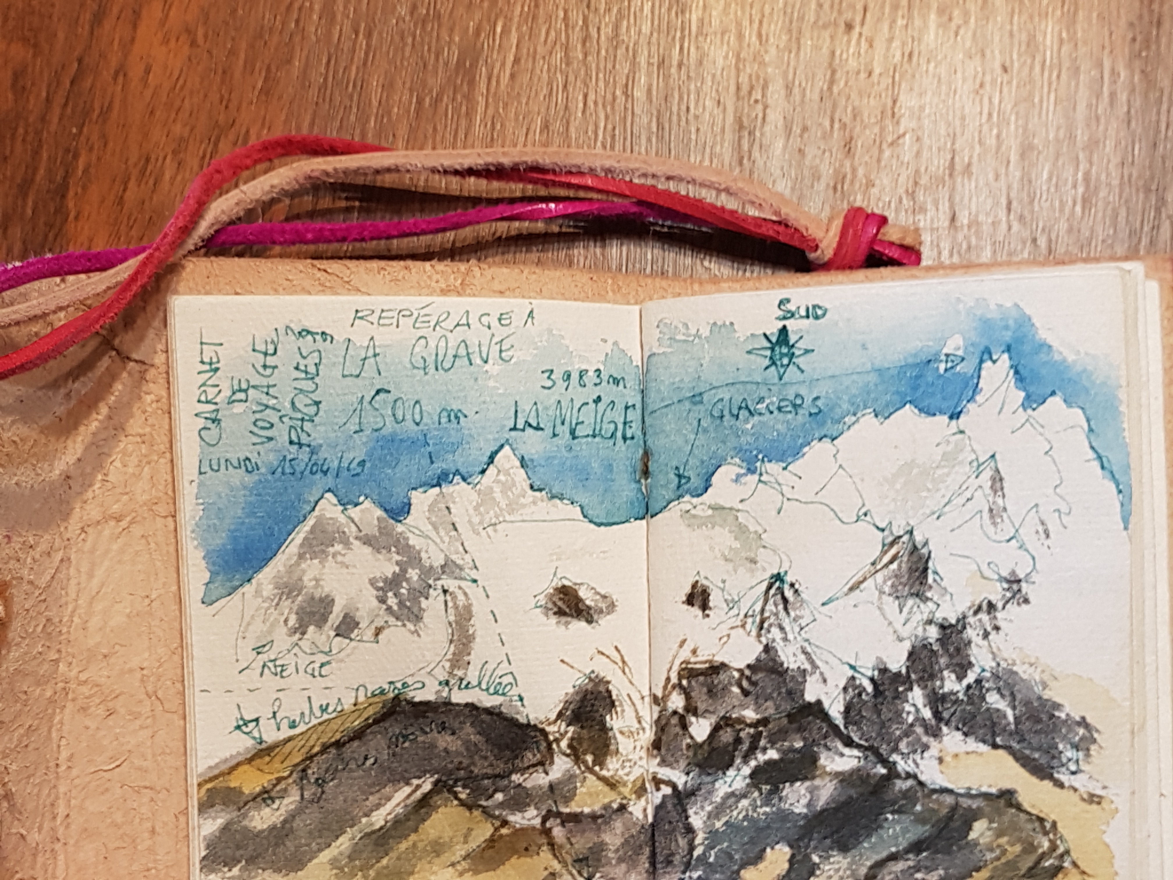 croquis aquarelle, carnet de voyage, la Grave, vue sur le glacier de la Meije